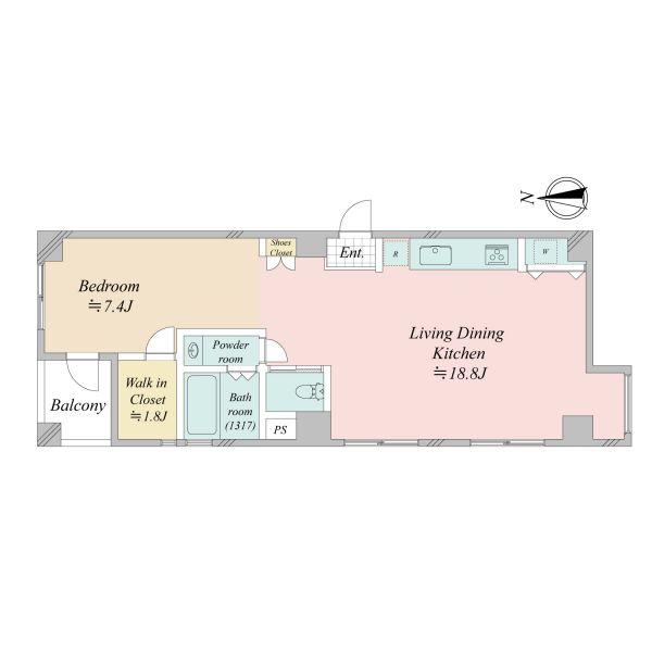 | 間取り | 1LDK | 間取り内訳 | 洋室約7.4帖・LDK約18.8帖・WIC約1.8帖 |