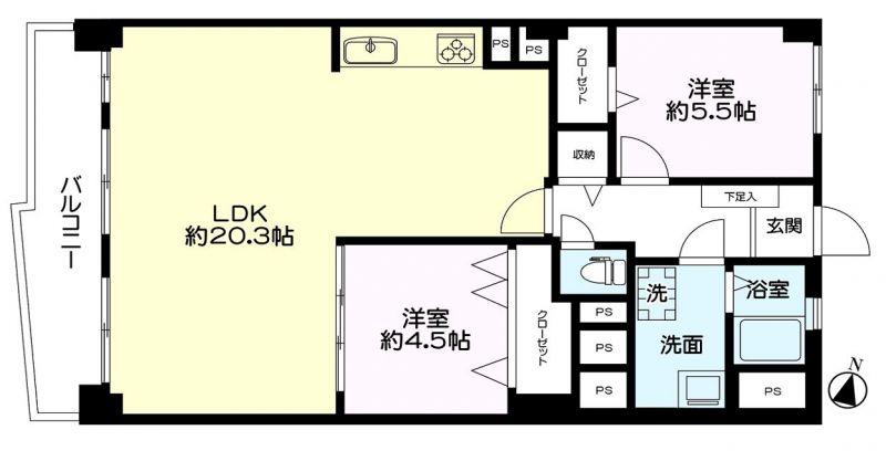 間取り 2LDK 間取り内訳 洋室約5.5帖・洋室約4.5帖・LDK約20.3帖