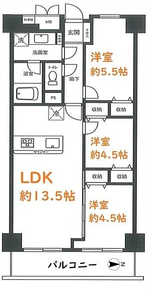 | 間取り | 3LDK | 間取り内訳 | 洋室約5.5帖、洋室約4.5帖、洋室約4.5帖、LDK約13.5帖 |